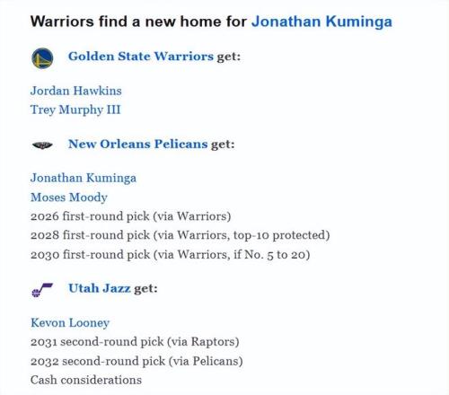 鹈鹕队得到:库明加、穆迪、2026年首轮签(来自勇士的无保护)、2028年首轮签(来自勇士,前10顺位保护)、2030年首轮签(来自勇士,顺位为5至20位时生效)