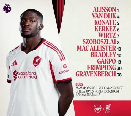 阿森纳vs利物浦:哲凯赖什、厄德高首发,维尔茨、加克波出战